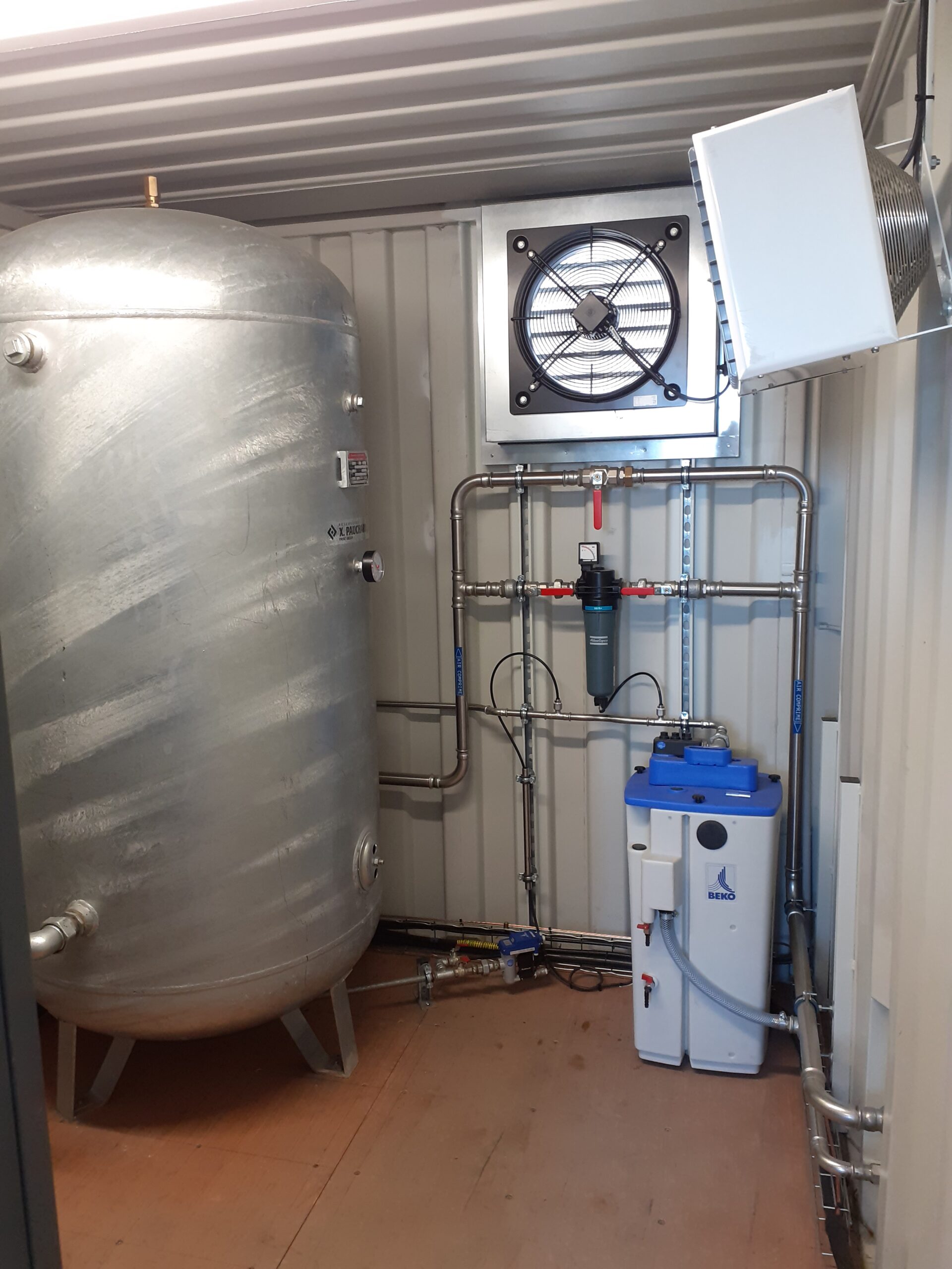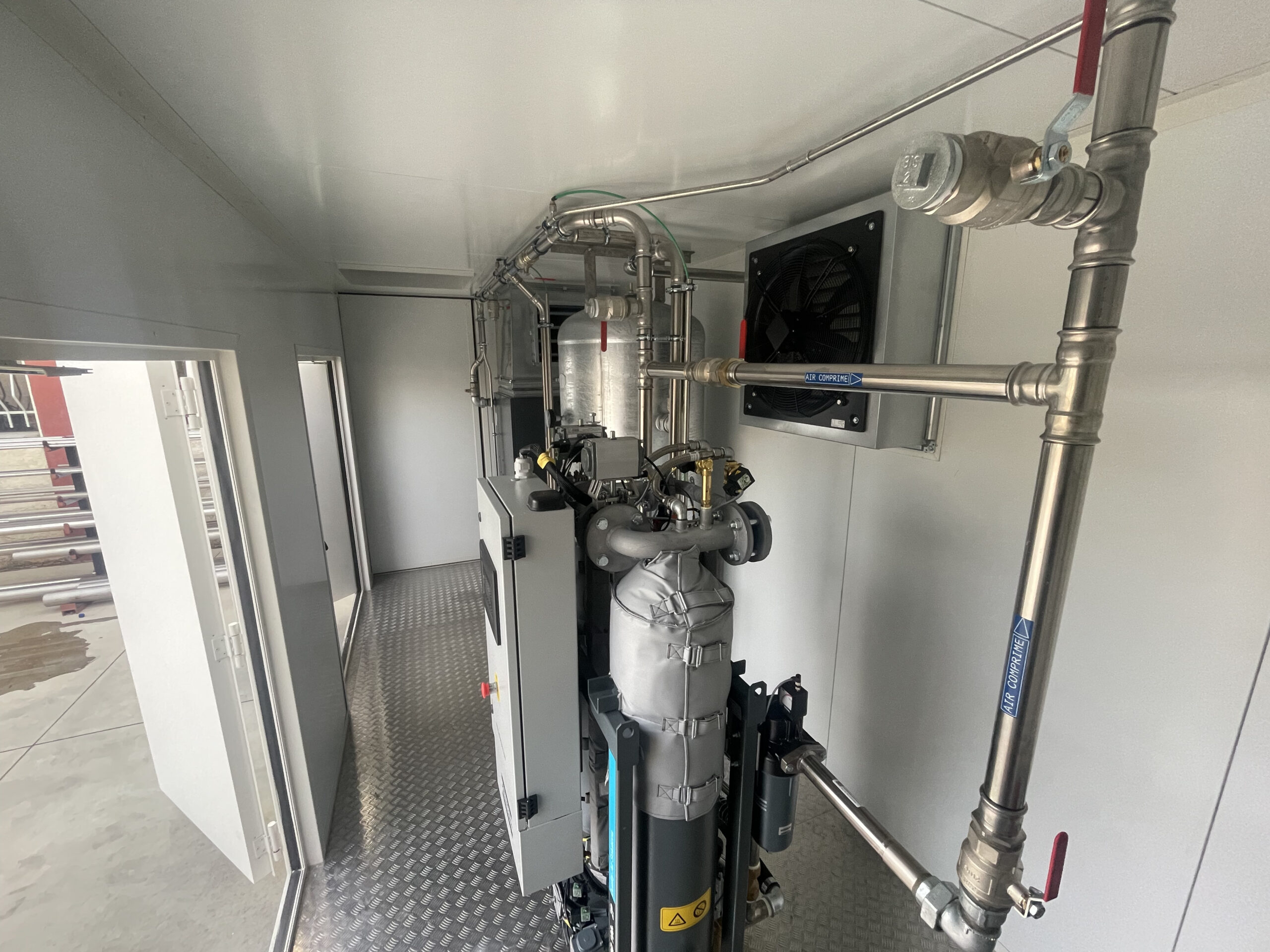 Cuves avec purgeurs sans perte d’air, séparateurs de condensats, filtration, unité d’air respirable, sont intégrés et assurent la qualité de l’air et l’efficacité du système. Nos containers sont pensés pour résister aux conditions environnementales et être autonomes. Ils peuvent disposer d’armoires électriques de distribution, de capteurs de débitmètre ou de contrôle du point de rosée, d’extracteurs d’air et de systèmes de chauffage pour assurer un fonctionnement hors gel. Les travaux de métallerie et d’isolation garantissent robustesse et durabilité, tandis que l’intégration des machines et la pose des tuyauteries assurent une organisation fluide et optimisée de l’espace à l’intérieur du container.